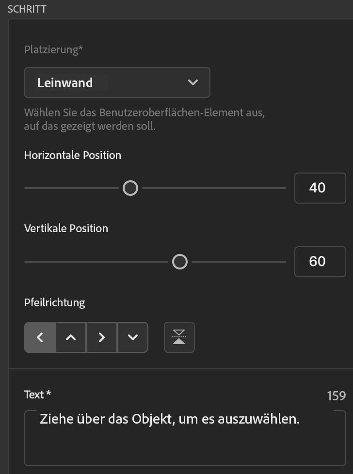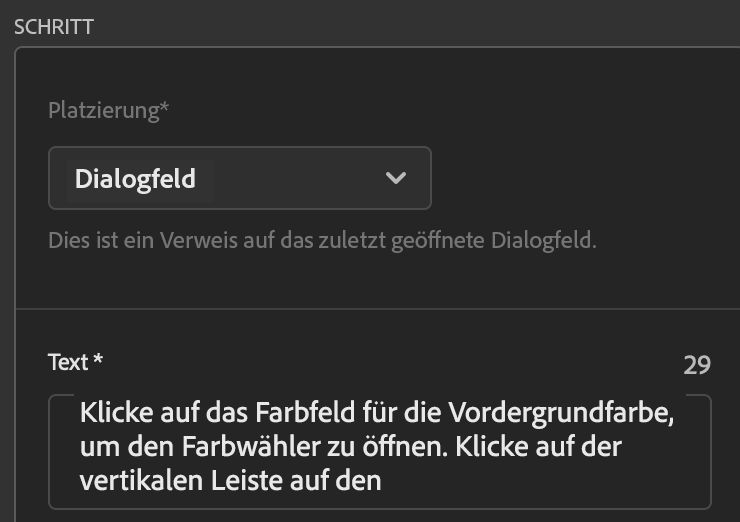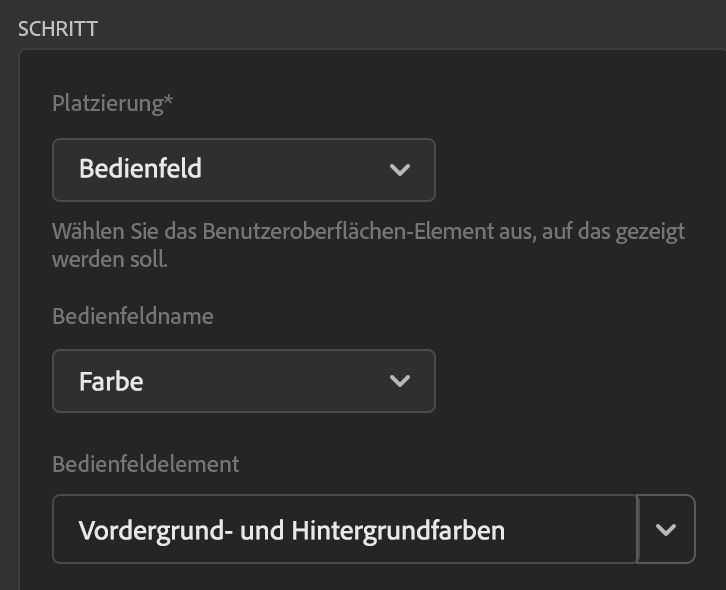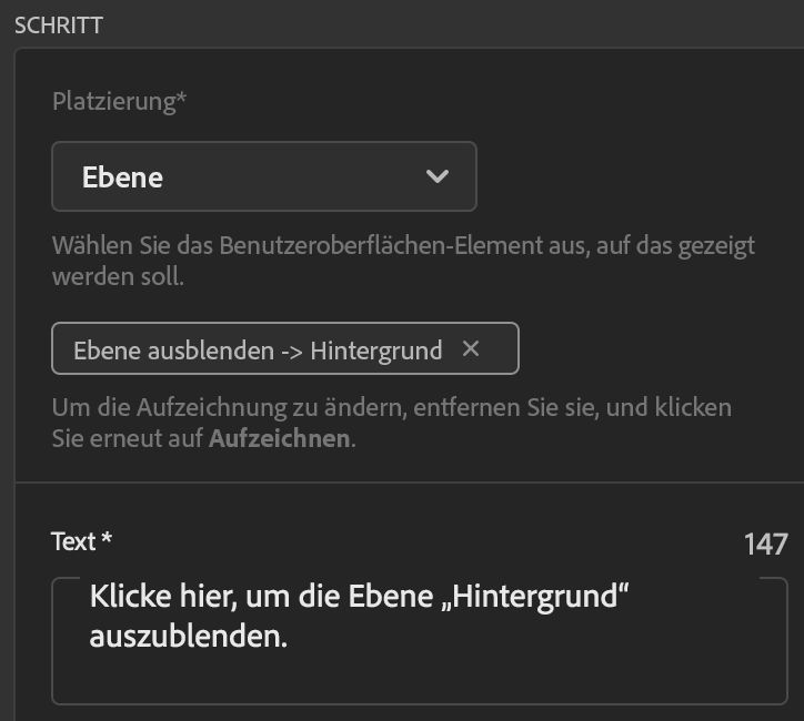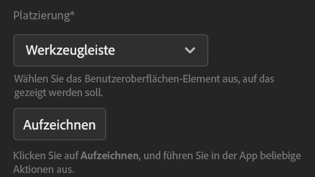 - Tutorial Builder zeigt nur dann den Button Aufzeichnen an, wenn die von dir gewählte Platzierungsart im Feld Platzierung das Aufzeichnen einer Hinweismarke unterstützt.