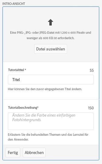 Wichtiger Tipp: Eine Vorschau deines Tutorials ist erst möglich, nachdem du deine Startdatei hochgeladen hast. Du kannst jederzeit zur Registerkarte „Fertig stellen“ wechseln, um die Startdatei hochzuladen.- Informationen zu den Anforderungen an Startdateien findest du unter [PS] Richtlinien für Elemente und [PS] Spezifikationen für Bilder.