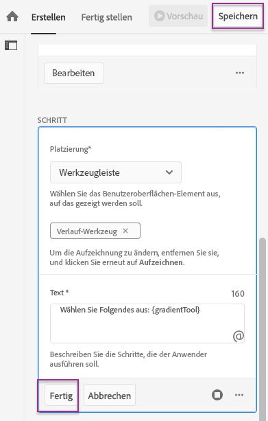 - Klicke sowohl auf Fertig unterhalb der Schrittdetails als auch auf Speichern oben in Tutorial Builder.