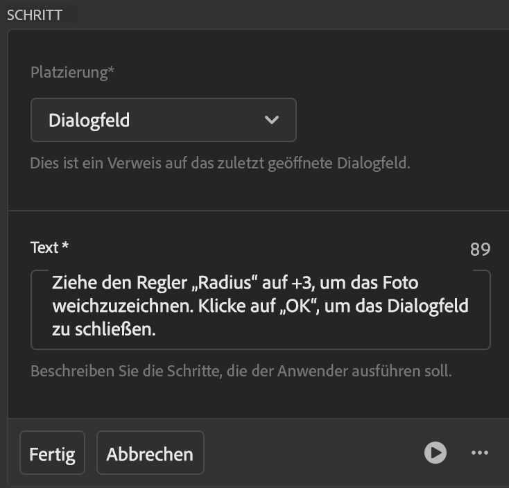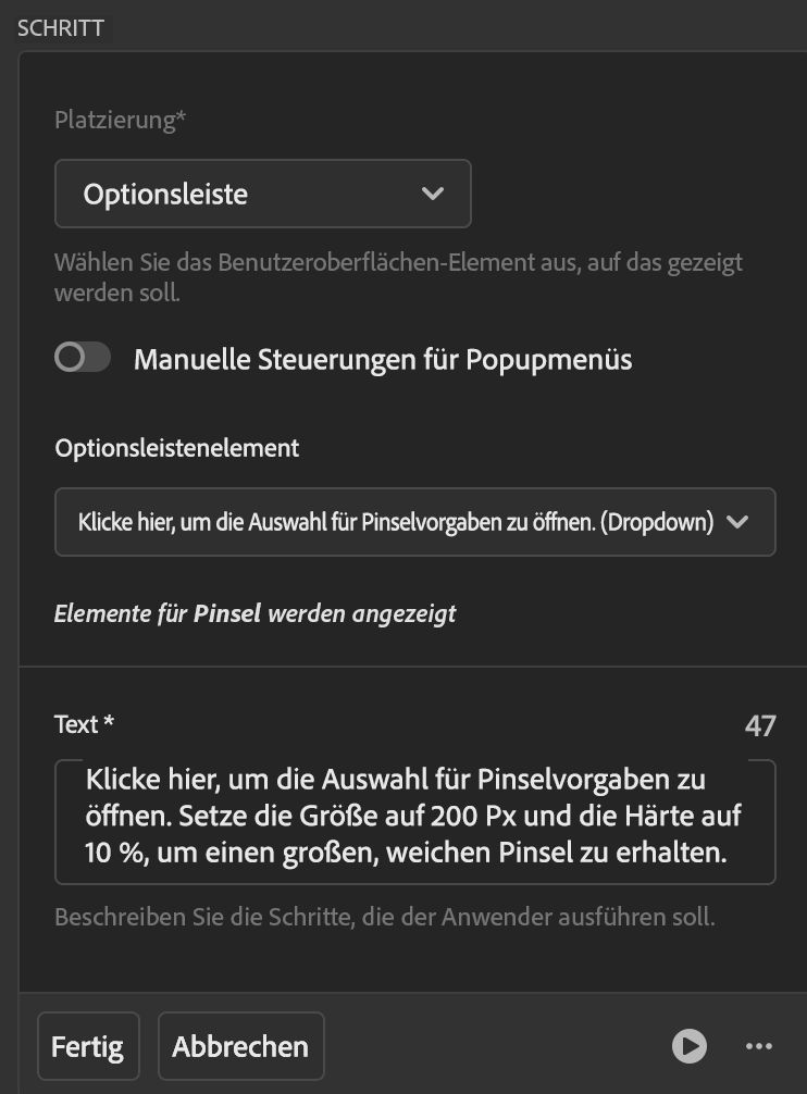 - Kicke auf den Play-Button unterhalb der Schrittdetails, um eine Vorschau der Hinweismarke auf der Arbeitsfläche anzuzeigen.