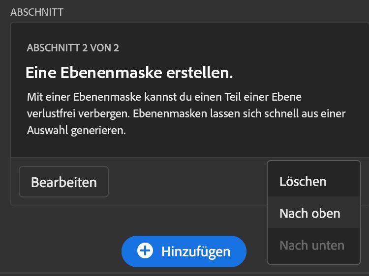 - Um einen Abschnitt und die zugehörigen Schritte zu löschen oder zu verschieben, klicke auf die drei Punkte unterhalb des Abschnitts. Wähle „Löschen“, „Nach oben“ oder „Nach unten“.