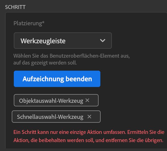 - Beispiel: Klicke auf das X der Aktion „Objektauswahl-Werkzeug“, damit nur die Aktion Schnellauswahl-Werkzeug übrig bleibt.