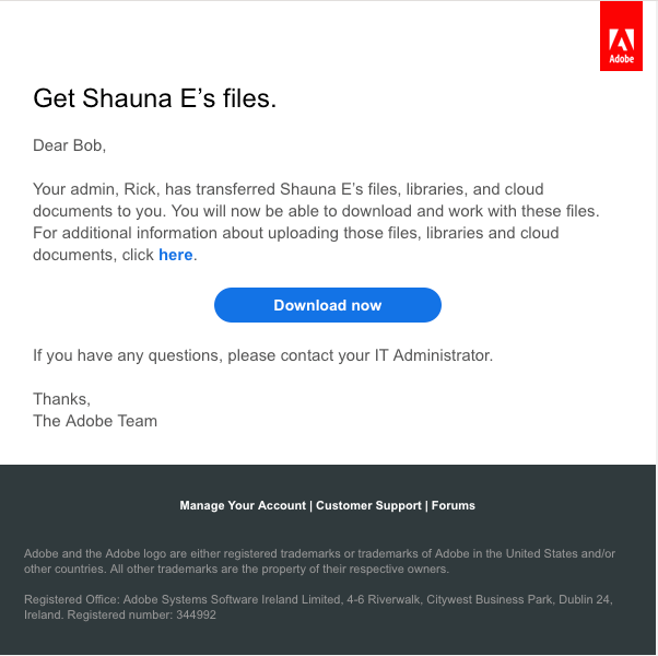 If you are using Adobe storage for business, your organization owns the user accounts and their associated content. When a user leaves the organization (or you delete a user's account), you can transfer the assets from user folders to another user using Admin Console.