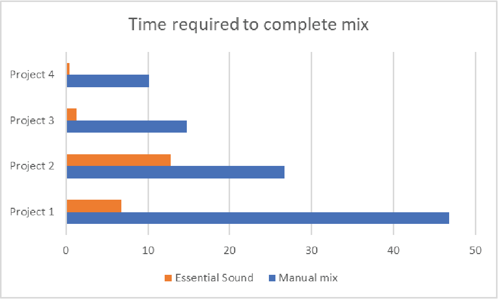 We tested audio workflows on four different projects, counting the number of clicks and measuring the time required to complete the same steps using manual audio adjustments versus the Essential Sound panel.
