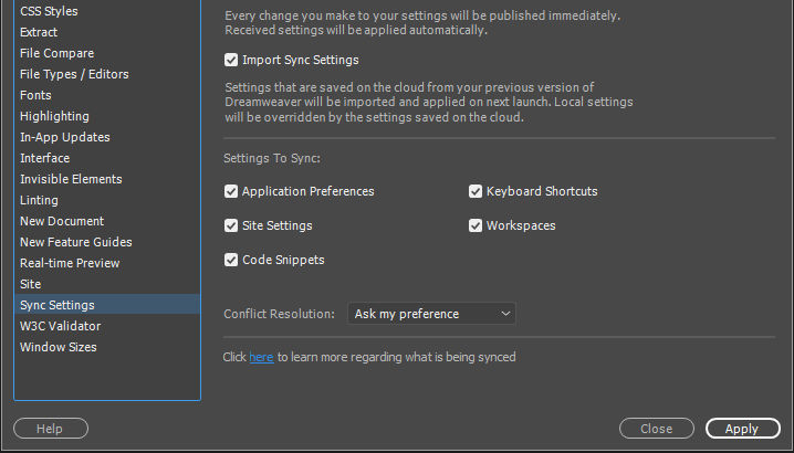 (13.1) If there are updates on the cloud that are downloaded onto your computer, the Sync Settings Now button changes to Apply Updates. You can choose to apply the updates immediately or close the Preferences dialog box to apply the updates at a later point in time. If you make any changes to the Dreamweaver instance on the computer before applying the updates, a conflict can arise, which is resolved based on the Conflict Resolution Settings.