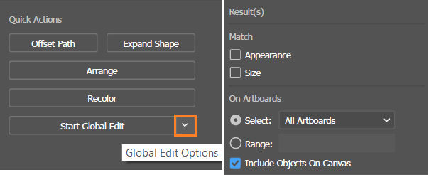 • Select Include Objects On Canvas to find similar objects within and outside the artboards. This option is selected by default. Deselect this option to limit the search only to artboards.