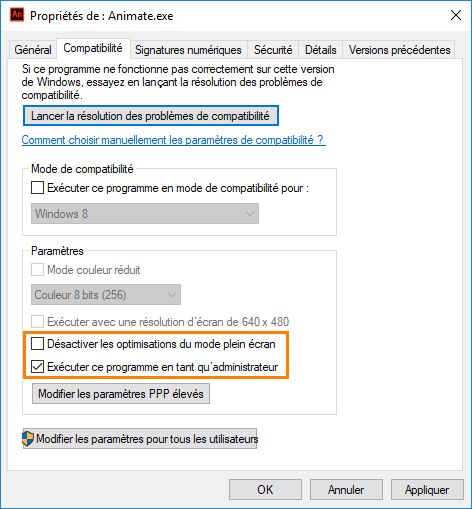 1. Cliquez avec le bouton droit de la souris sur Animate.exe, puis choisissez Propriétés.