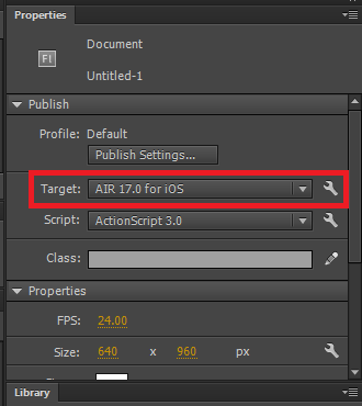 2. Dans le panneau Propriétés d’Animate, cliquez sur le bouton  en regard de la liste déroulante Cible pour afficher la boîte de dialogue Paramètres AIR for iOS.