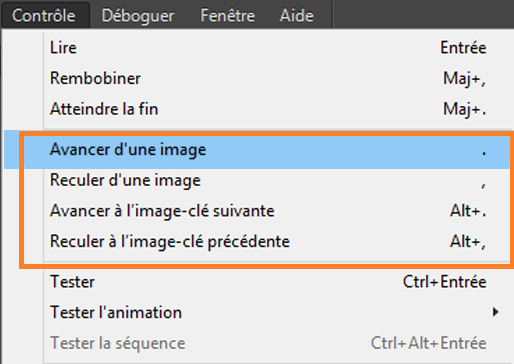 Vous pouvez naviguer entre les images-clés sur le calque actif à l’aide du menu Contrôle. Vous pouvez également utiliser la combinaison de touches Alt+. ou Alt+, pour avancer ou reculer jusqu’aux images-clés suivantes et précédentes respectivement dans le scénario.