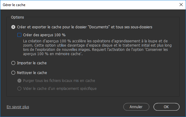 - Sélectionnez Créer des aperçus 100 % pour créer l’aperçu complet des images dans la mémoire cache. Cette option est désactivée par défaut.