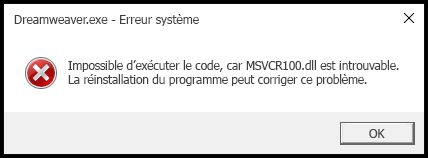 Dreamweaver affiche une erreur si le composant d’exécution Microsoft Visual C++ (x64 et x86) n’est pas disponible ou n’est pas installé sur le système.