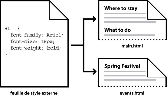 Le style (qui est défini par une règle ou par un groupe de règles) se trouve dans un emplacement distinct de celui du formatage du texte réel, généralement dans une feuille de style externe ou dans la section head du document HTML. Ainsi, une règle concernant les balises h1 peut s’appliquer à de nombreuses balises à la fois (et dans le cas de feuilles de style externes, la règle peut s’appliquer à de nombreuses balises à la fois dans un grand nombre de pages différentes). De cette façon, CSS offre une capacité de mise à jour extrêmement aisée. Lorsque vous mettez à jour une règle CSS dans un emplacement, le formatage de tous les éléments qui utilisent le style défini est automatiquement mis à jour en fonction du nouveau style.