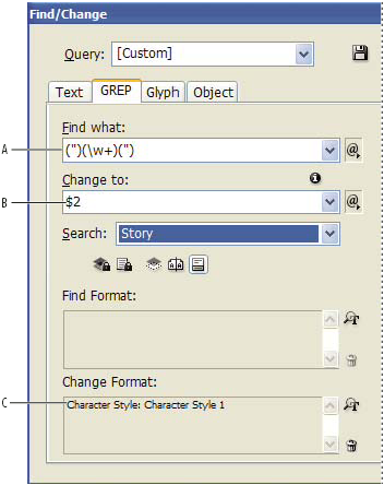 Définissez les champs Rechercher et Remplacer par (voir les sections Métacaractères de recherche et Recherche à l’aide d’expressions GREP).