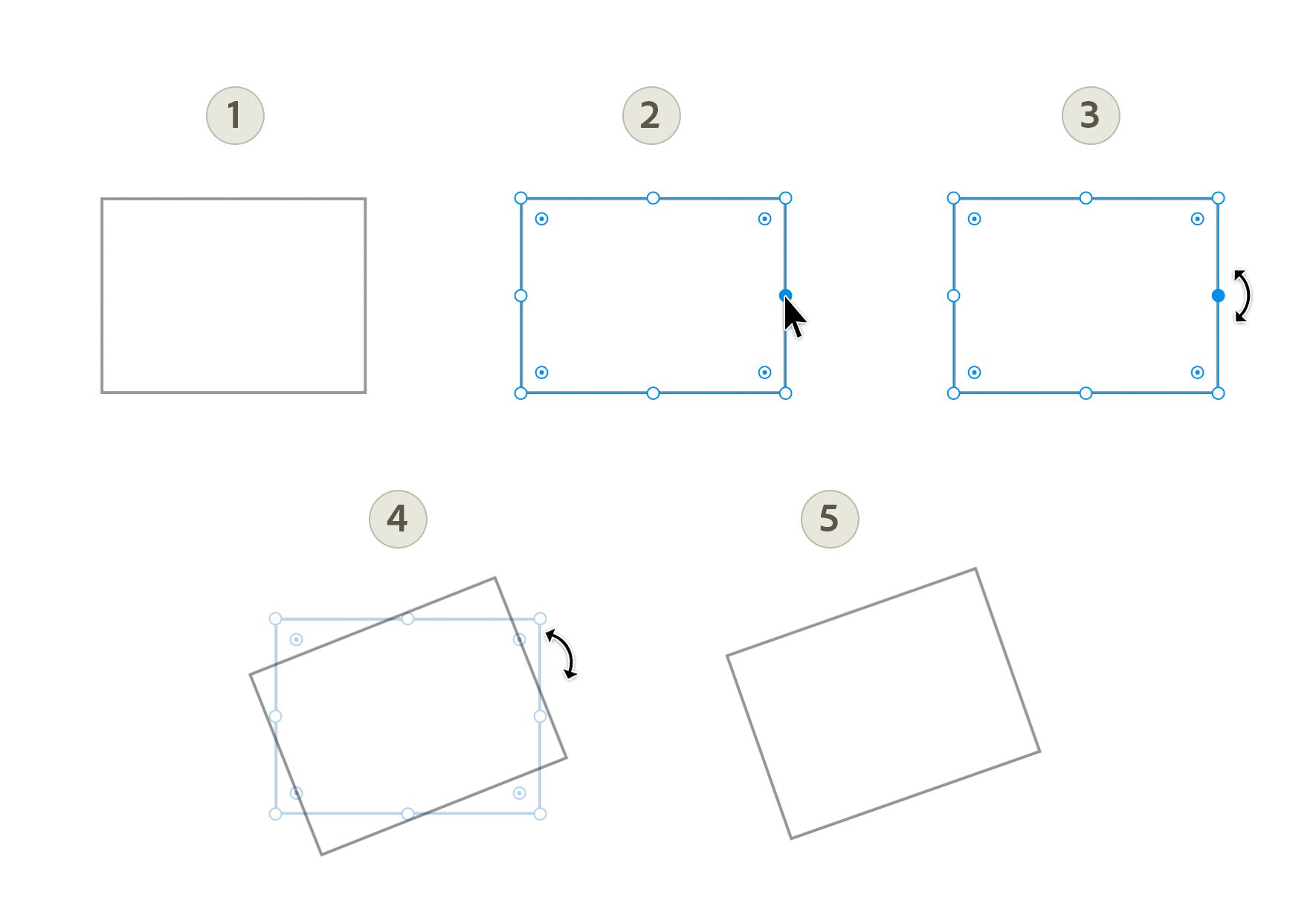 Placez le curseur sur les poignées circulaires, puis déplacez-le légèrement vers l’extérieur afin de faire apparaître le curseur de rotation (icône).
