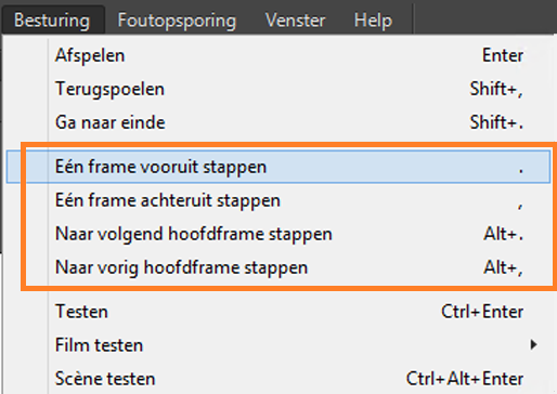 Met het menu Besturing kunt u navigeren tussen hoofdframes in de actieve laag. U kunt ook gebruiken Alt+. of Alt+, om vooruit en achteruit naar volgende of vorige keyframes respectievelijk in de chronologie te bewegen.