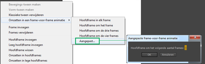 De optie Omzetten in een frame-voor-frame animatie is beschikbaar in het menu Wijzigen. U kunt de gewenste toetsen ook toewijzen in het dialoogvenster Sneltoets om deze taken uit te voeren.
