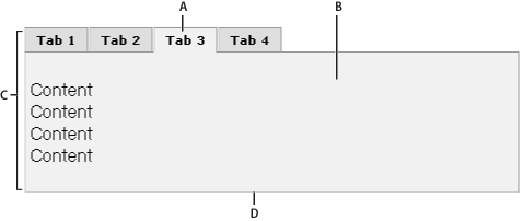 A. Tab B. Inhoud C. Widget deelvensters met tabs D. Paneel met tabs