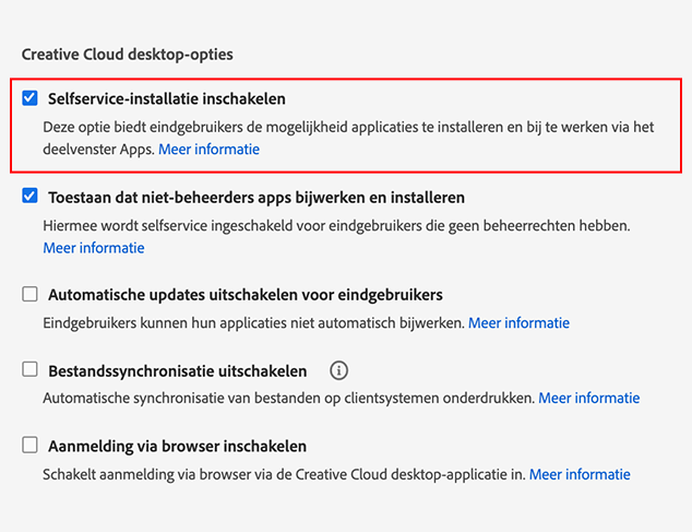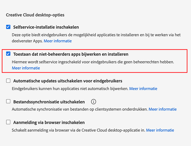 - U kunt ook de optie Selfservice-installatie inschakelen kiezen en de optie Toestaan dat niet-beheerders apps bijwerken en installeren niet kiezen. In dit geval kunnen alleen gebruikers met de juiste beheerdersrechten apps op hun computer installeren en bijwerken.