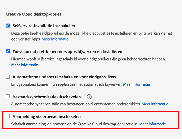 Standaard moeten gebruikers zich aanmelden via de Creative Cloud-desktop-app. U kunt er echter voor kiezen gebruikers om te leiden, zodat ze zich kunnen aanmelden via de browser door Aanmelding via browser in te schakelen.
