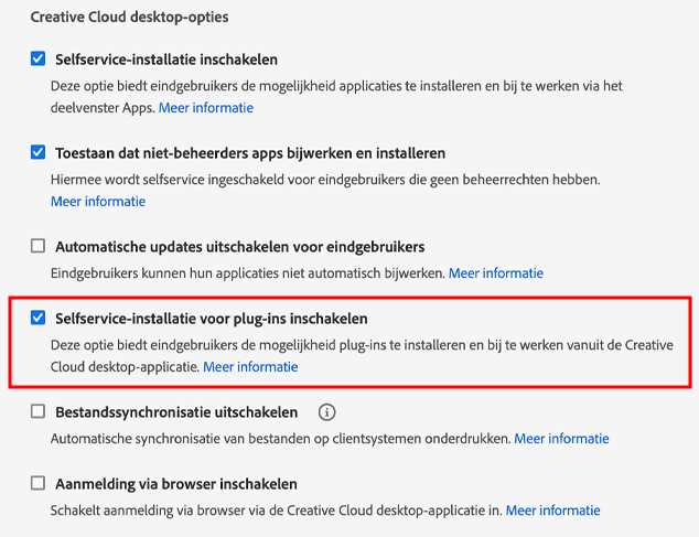 Als beheerder kunt u plug-ins aan uw pakket toevoegen terwijl u een beheerd pakket maakt. Deze plug-ins zijn ook beschikbaar in de Creative Cloud-desktop-app. Gebruik de optie Selfservice-installatie voor plug-ins inschakelen om toe te staan dat gebruikers plug-ins installeren en bijwerken via de Creative Cloud-desktop-app. Wanneer u deze optie inschakelt, moeten gebruikers de Creative Cloud-desktop-app stoppen en opnieuw starten of zich afmelden en weer aanmelden om de wijziging door te voeren.