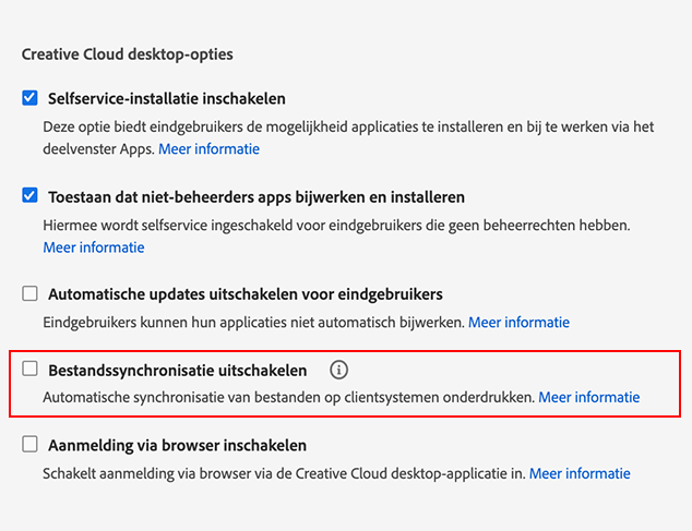 Als beheerder kunt u ervoor kiezen om Creative Cloud-bestandssynchronisatie op de computers van eindgebruikers uit te schakelen. Bestandssynchronisatie is standaard ingeschakeld. Het is echter handig om deze optie uit te schakelen wanneer u pakketten in een testomgeving distribueert. Als u distributiescenario's test, is het immers niet nodig dat grote aantallen bestanden tussen apparaten worden gesynchroniseerd.