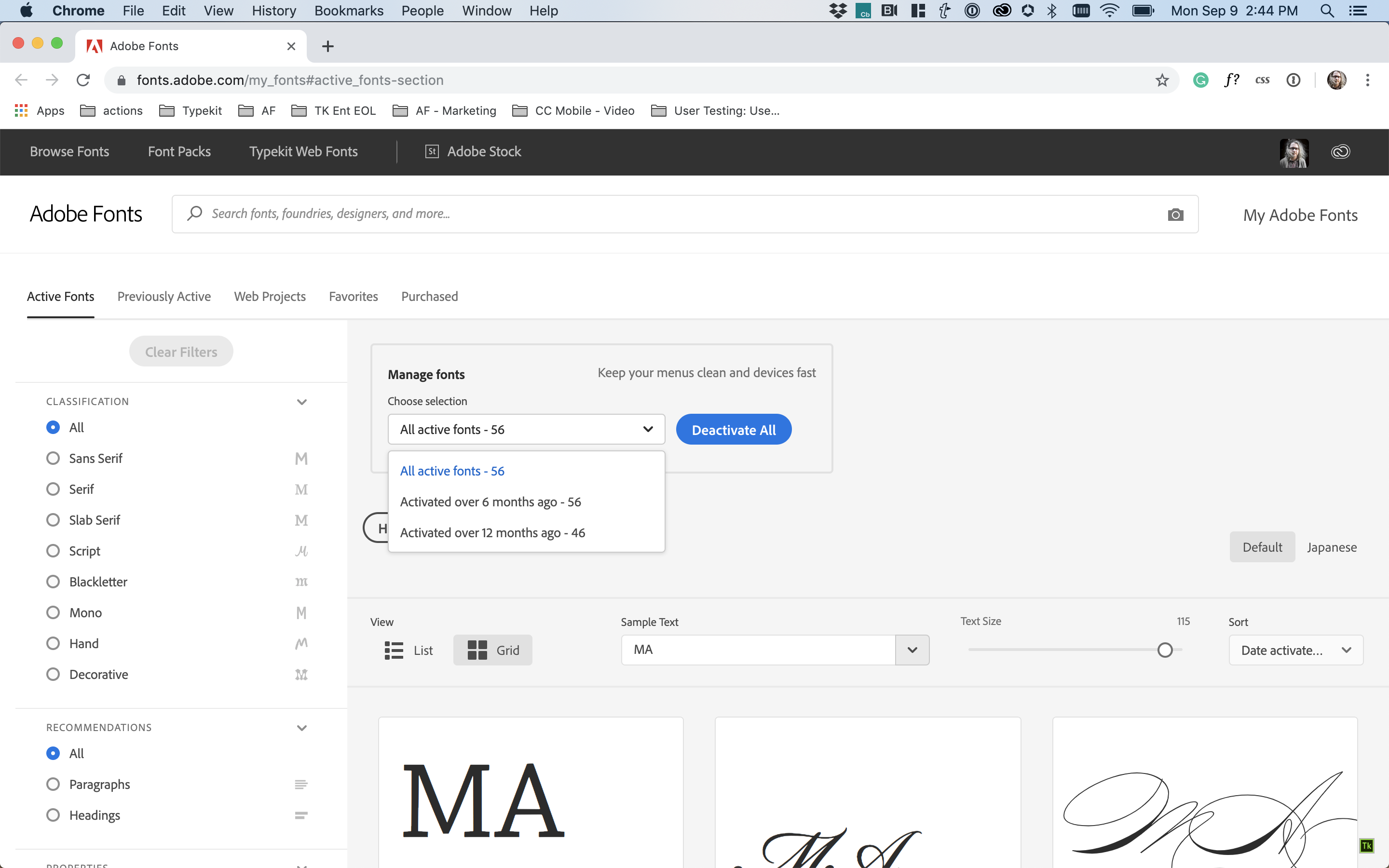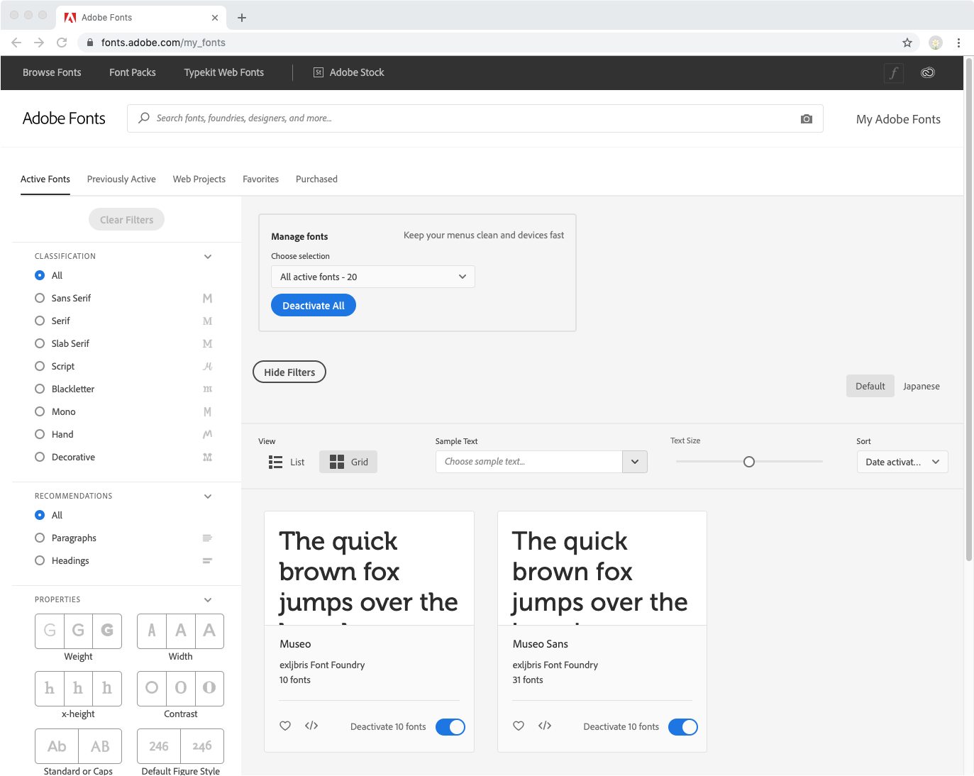 rechtsboven in de Creative Cloud desktop-app om het deelvenster voor lettertypebeheer weer te geven. Van daaruit kun je snel lettertypen verwijderen die je niet meer nodig hebt, lettertypen toevoegen die je de laatste tijd niet in Creative Cloud hebt gebruikt of eerder toegevoegde lettertypen bekijken om te zien welke lettertypen je eerder hebt toegevoegd.