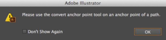 Tijdens het werken met het gereedschap Ankerpunt is het uiterst belangrijk om precies te kunnen richten en op de handgrepen (of het ankerpunt) te klikken. Als u ergens anders klikte, werd een waarschuwing weergegeven (zoals hierboven).