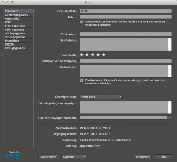 Het dialoogvenster Bestandsinfo (Bestand > Bestandsinfo) heeft een nieuwe opzet, met een nieuwer framework. De schermafbeelding hieronder toont de nieuwe lay-out van het dialoogvenster Bestandsinfo.