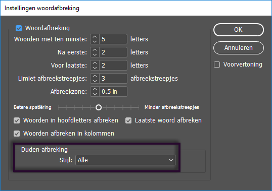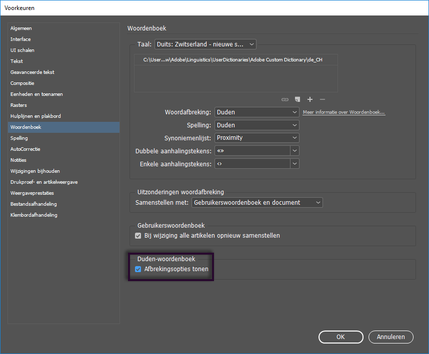 Als u Duden-afbrekingen wilt gebruiken, gaat u naar Voorkeuren > Woordenboek en selecteert u Afbrekingsopties tonen.