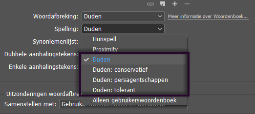 Er zijn vier spellingcontrolestijlen. Voor een consistente spelling, waarbij slechts een van de varianten geldig is (dus Delphin of Delfin), kiest u Duden, Conservatief of Persagentschappen. Als u echter alleen spellingfouten wilt aangeven als fout, kiest u Tolerant.