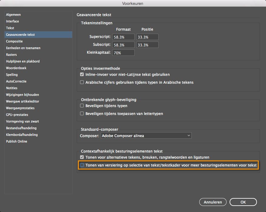 Ga in InDesign naar Bewerken > Voorkeuren > Geavanceerde tekst.