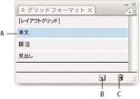 In the Named Grids panel, the Layout Grid format is shown by default. The layout grid setting for the currently selected page is reflected in this grid format. When more than one layout grid is set for a single document, the settings shown in Layout Grid in the Named Grids panel vary depending on the selected page layout grid contents.