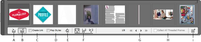 A. Tool Inhoud verzamelen B. Tool Inhoud plaatsen C. Koppeling maken D. Stijlen toewijzen E. Aangepaste stijltoewijzing bewerken F. Opties voor plaatsen G. Bladeren H. Alle verbonden kaders verzamelen I. Conveyor laden
