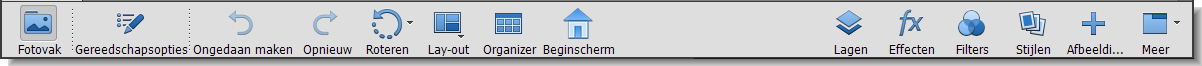 Onder aan Photoshop Elements ziet u op de taakbalk knoppen voor de meestgebruikte deelvensters en de meest uitgevoerde handelingen tijdens het bewerken en wijzigen van afbeeldingen. U kunt de knoppen Fotovak en Toolopties gebruiken om te schakelen tussen de weergave van miniaturen en toolopties. U kunt de bewerkingen snel ongedaan maken en opnieuw uitvoeren, afbeeldingen roteren of de lay-out wijzigen. U kunt ook op de knop Organizer klikken om Photoshop Elements Organizer te starten. Met de knop Beginscherm krijgt u toegang tot het beginscherm. In de modus Expert klikt u op de pijl naast de knop Meer. U ziet dan de optie waarmee u kunt schakelen tussen de werkruimten Standaard en Aangepast.
