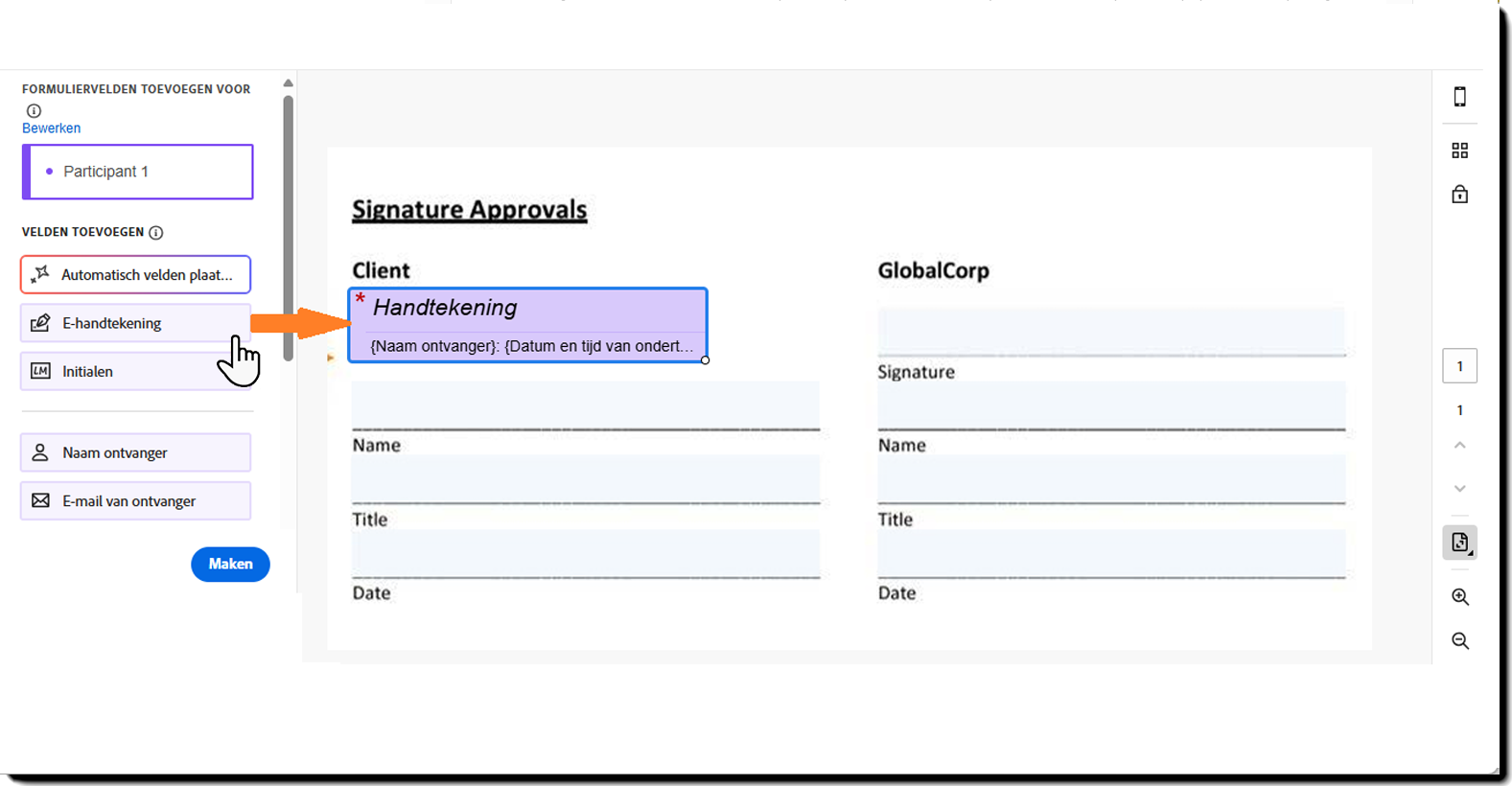 Als u handmatig velden wilt toevoegen, selecteert u een veldtype in het rechterdeelvenster en sleept u het naar de gewenste plek in het document. Bij het handmatig plaatsen van een veld wordt het automatisch toegewezen aan de geselecteerde deelnemer.