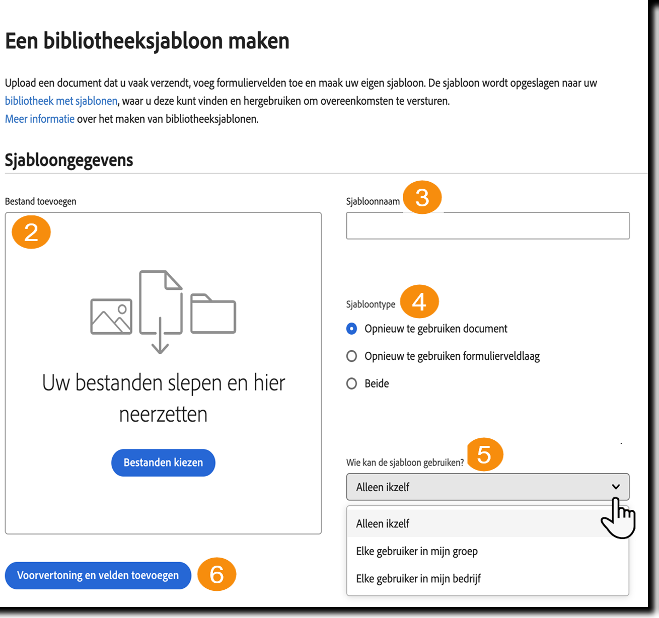 Met bibliotheeksjablonen kunnen gebruikers herbruikbare, interactieve documenten maken. Deze sjablonen kunnen variëren van eenvoudige overeenkomsten met één handtekeningveld, zoals geheimhoudingsovereenkomsten, tot complexe formulieren voor belastingaangiften of de onboarding van medewerkers.