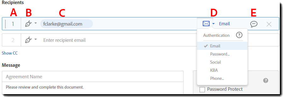 C. E-mailadres – Dit is het identificerende e-mailadres van de ontvanger, dat wordt gebruikt voor alle e-mailcommunicatie met de ontvanger, inclusief het verzoek om te ondertekenen.