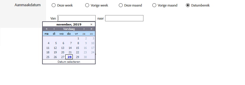 De aanmaakdatum is de tijdsperiode die het rapport moet beslaan. Dit kan een van de vier vooraf ingestelde periodes zijn (deze week, vorige week, deze maand, vorige maand) of een door u ingevoerd datumbereik.