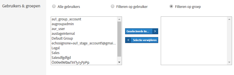 Met deze parameter kunt u het rapport uitvoeren op specifieke gebruikers of groepen. U kunt een of meer gebruikers of groepen kiezen of het rapport voor alle gebruikers in het account uitvoeren.