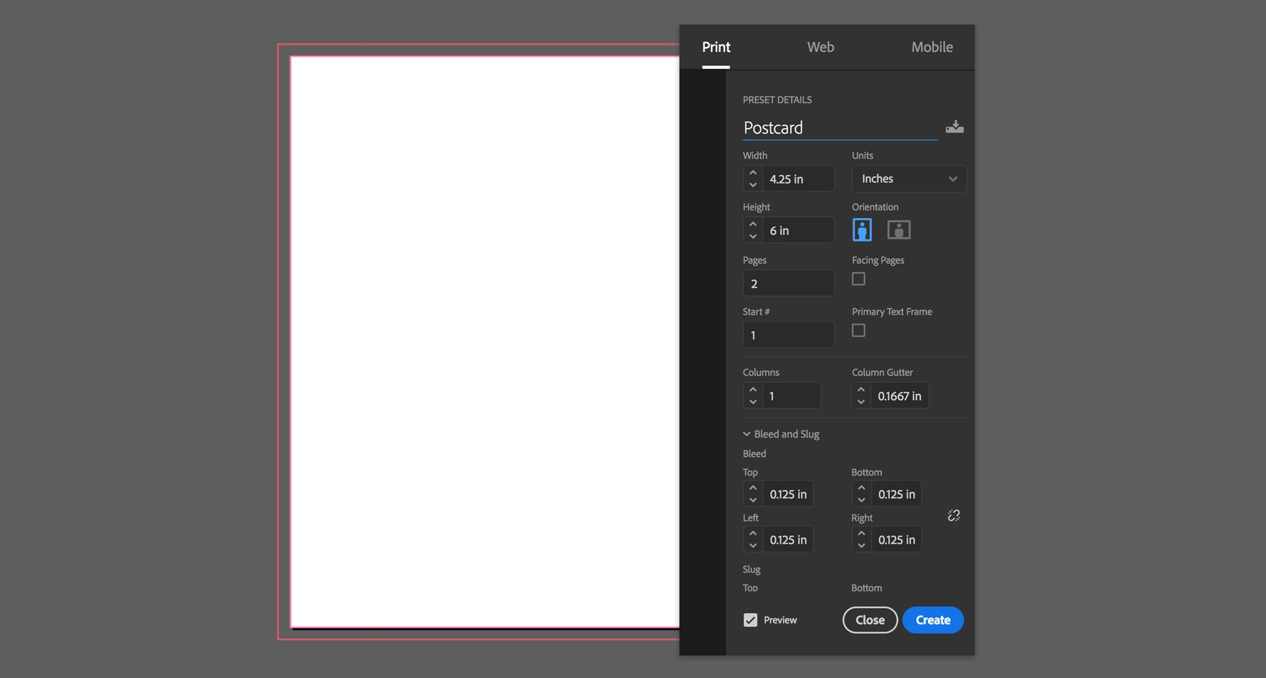 Click Create new, and then click the Print tab to automatically configure some settings. We changed several settings to customize our postcard. We also added a print bleed, so our design can print to the very edge of the postcard. Select Preview to see a live update.
