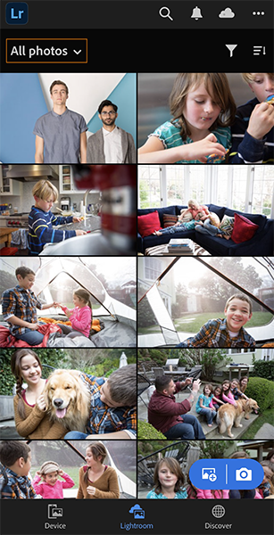 All Photos view for subscribed users is a collection of all your edited and imported Lightroom photos across devices. To access the All Photos view, tap Lightroom on the bottom panel of the screen and tap All Photos from the drop-down menu.
