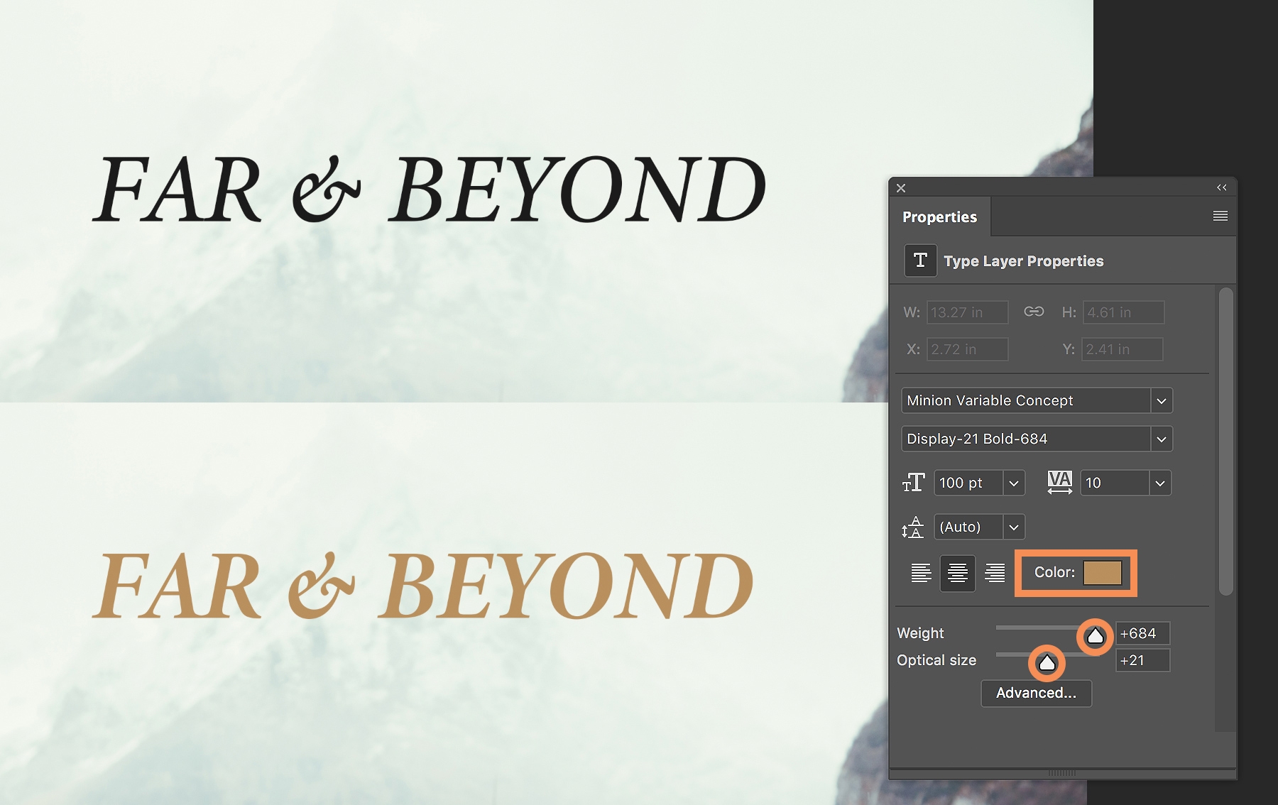 Tip: As you adjust the sliders, Photoshop automatically selects the font style closest to your current settings. For example, increasing the Slant of a Regular font style (like Acumin Variable Concept Regular) automatically changes it to an italic style variation.