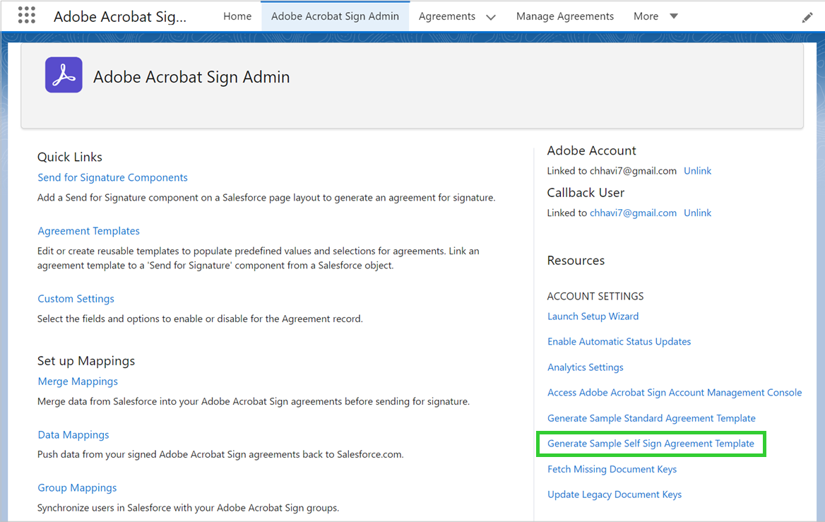 Note: Ideally, you must select Generate sample agreement templates option while linking your Acrobat Sign account to Salesforce.
