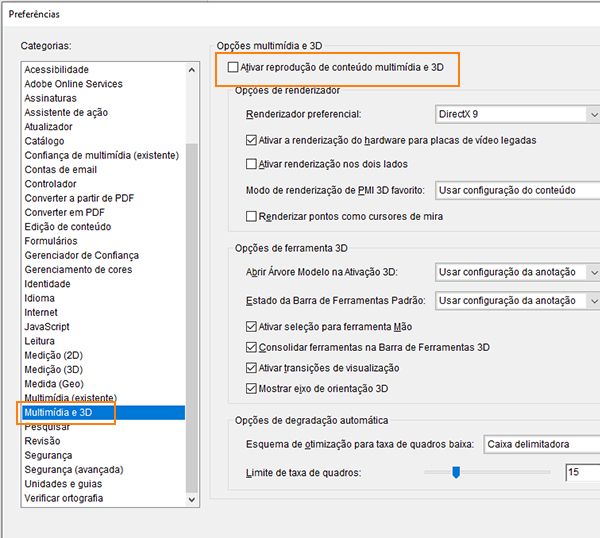 Por padrão, o conteúdo 3D nos PDFs é desativado devido a possíveis vulnerabilidades de segurança. Para ativar a reprodução de conteúdo 3D, selecione a opção "Habilitar a reprodução de conteúdo 3D" no painel Multimídia e 3D.