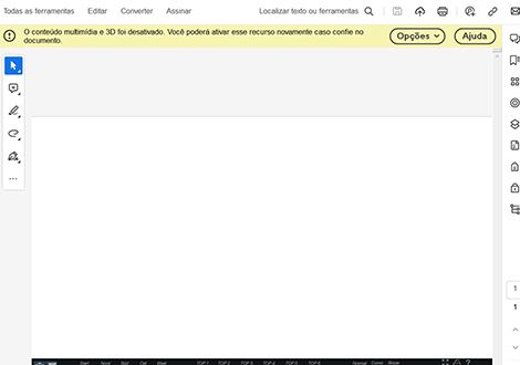 Ao abrir um PDF com um conteúdo 3D, uma barra amarela aparece na parte superior com a mensagem O conteúdo multimídia e 3D foi desabilitado. Habilite esse recurso se confiar no documento.