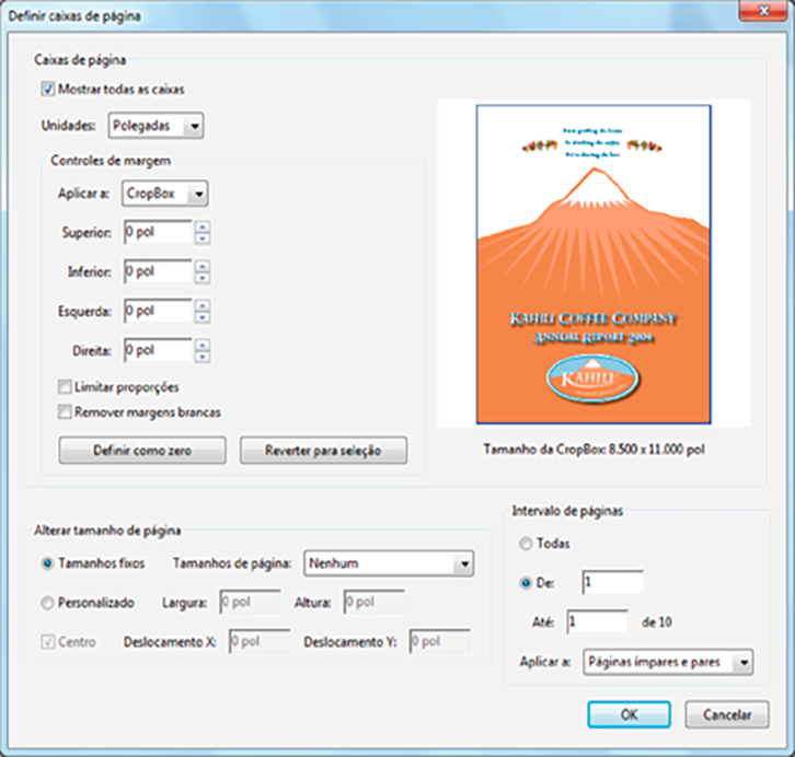 É possível alternar entre as caixas sem perder as margens definidas para cada uma. À medida que cada caixa é ajustada, a visualização na caixa de diálogo Definir caixas de página é reestruturada para refletir as novas configurações. Por exemplo, se a caixa recortar ou a caixa de mídia for expandida, o conteúdo da página "encolhe" na visualização.