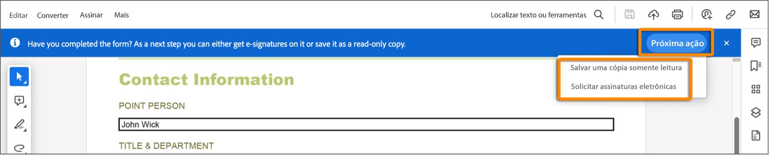 • Para obter assinaturas de outras pessoas, clique em Próxima ação > Solicitar assinaturas eletrônicas.
