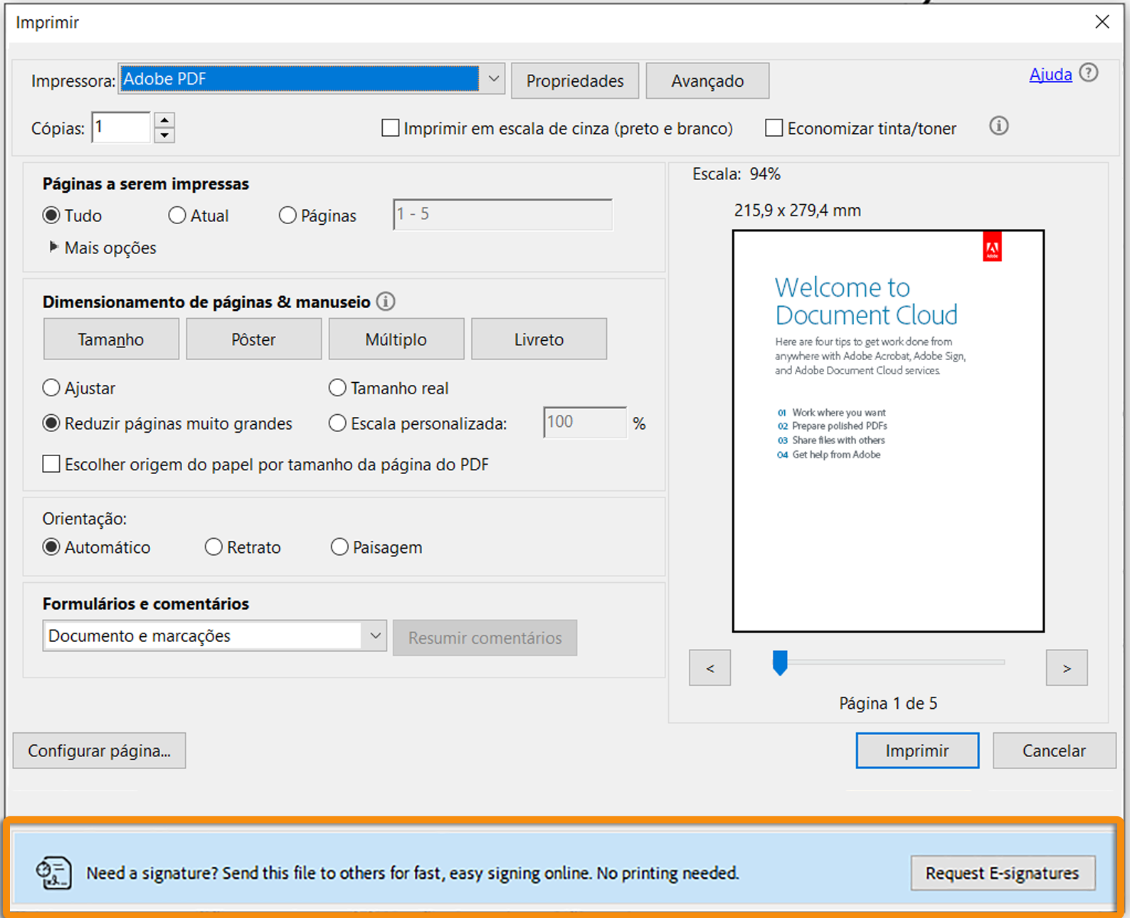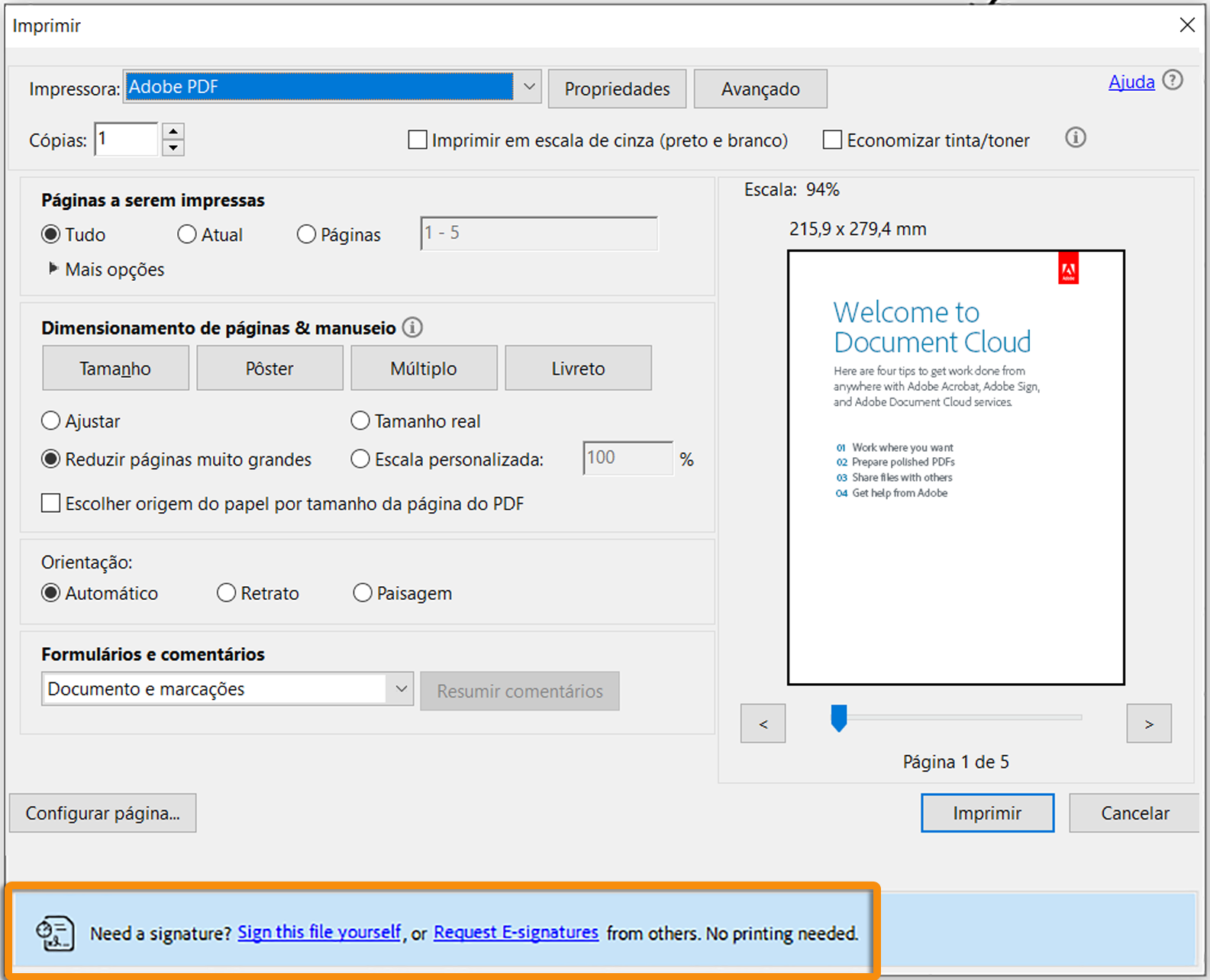 Variante 2: uma faixa azul na parte inferior da caixa de diálogo Imprimir se você quiser assinar o documento ou Solicitar assinaturas eletrônicas