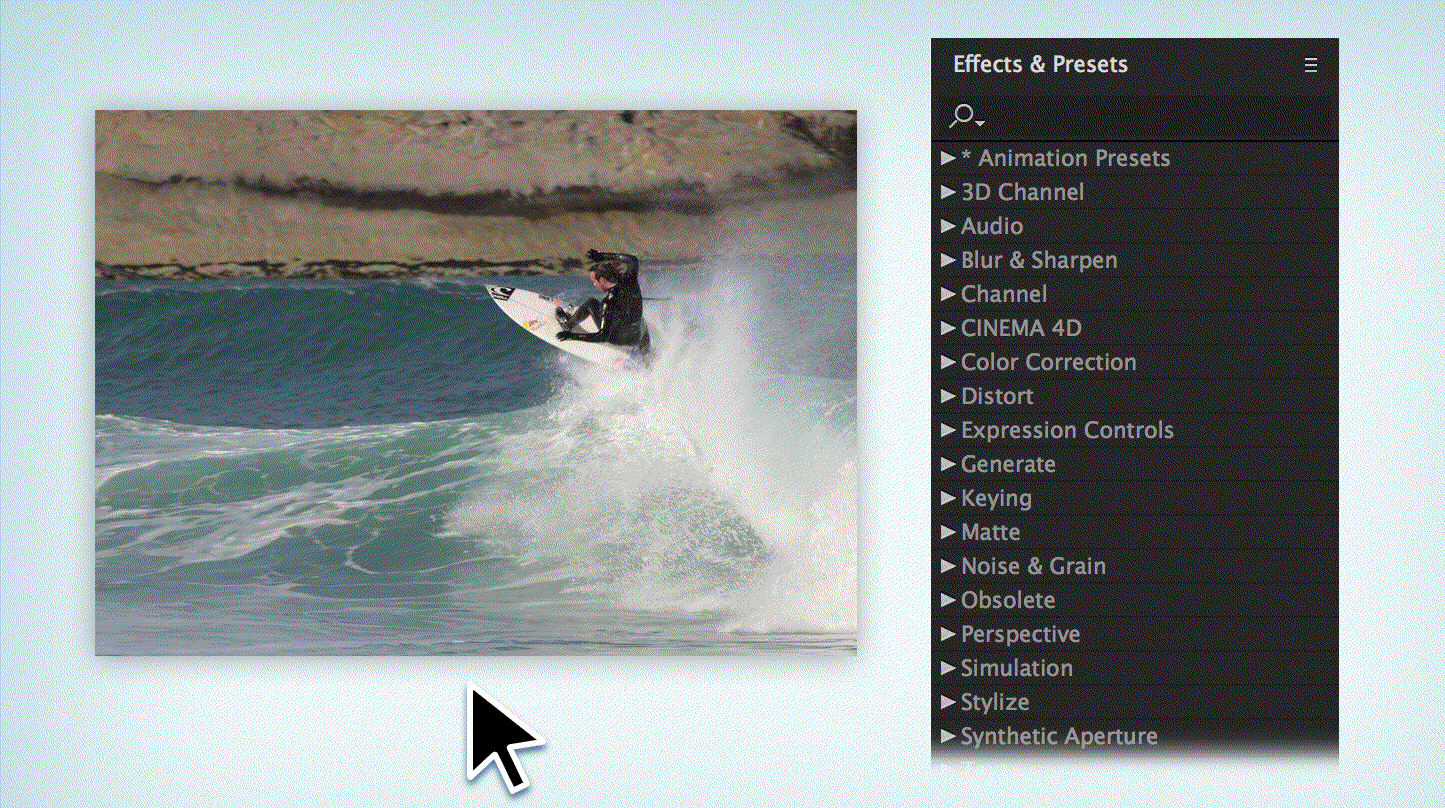 No painel Efeitos e predefinições, clique na caixa de pesquisa e digite Deblur da vibração da câmera.