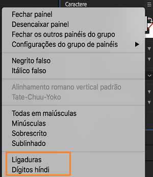 Você pode usar o uso de dígitos Hindi ativando a opção Dígitos Hindi no painel Caractere. Você também pode ativar a opção usando a caixa de seleção Dígitos Hindi na parte inferior do painel Caractere.